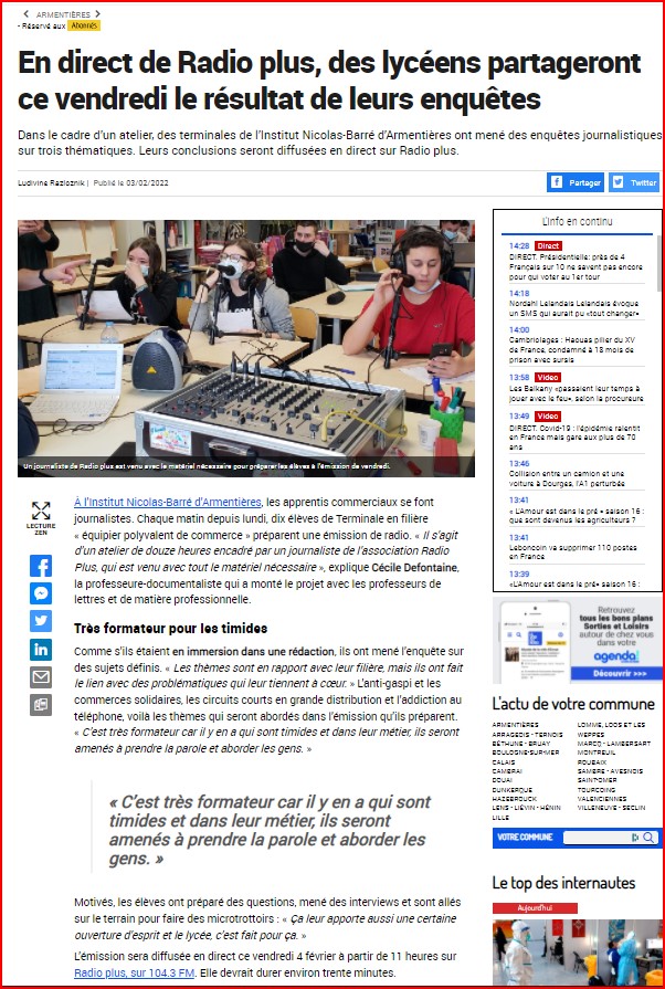 Emission en direct sur RADIO PLUS avec la classe média du collège Pierre et Marie Curie de Liévin