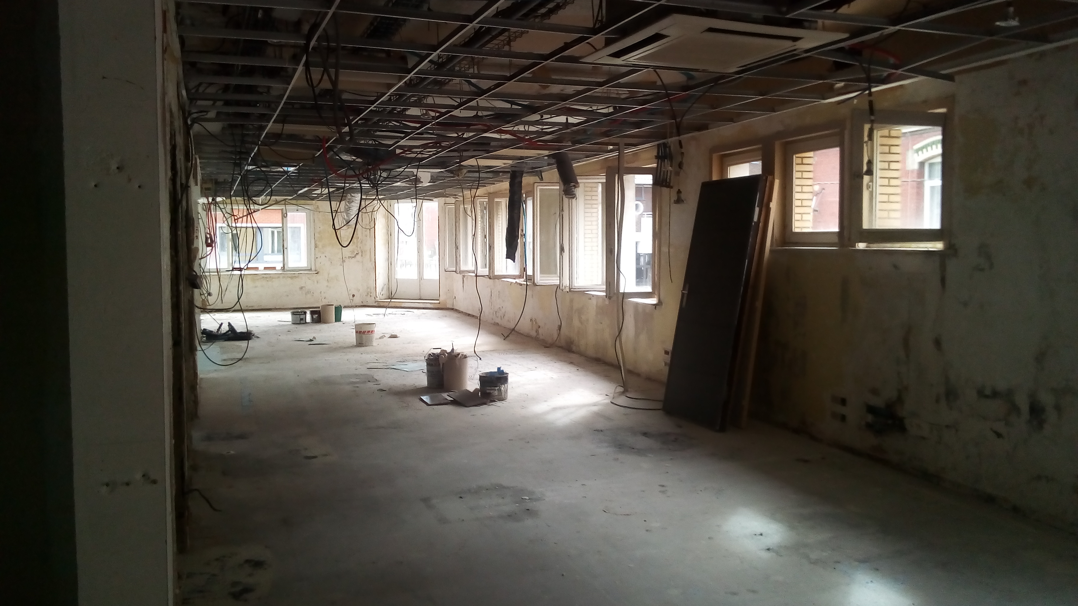 Un aperçu de l’étage en travaux où seront installés plusieurs bureaux. La salle est vide, le plafond retiré, avec les câbles et tuyauteries apparents, quelques pots de peinture et divers outils se trouvent au sol.