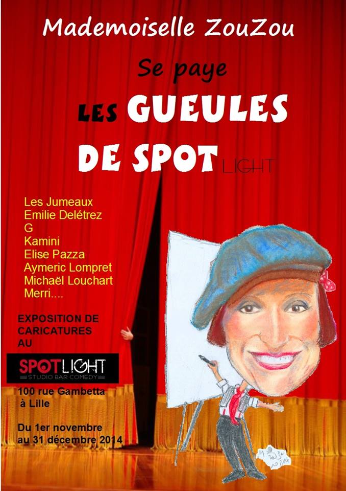 Mademoiselle Zouzou est notre invitée, à l’occasion de l’exposition Mademoiselle Zouzou se paye les Gueules de Spot(light) qui se tient au Spotlight de Lille du 1er novembre au 31 décembre. Elle y a croqué les humoristes têtes d’affiche de ce lieu et viendra donc nous parler de cette expo.