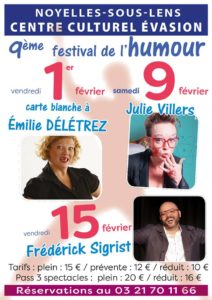 Ainsi qu’une interview de Julie Villers, à l’occasion de sa venue dans la région, pour le 9ème Festival de l’Humour de Noyelles-sous-Lens, Julie s’y produira le 09 février.