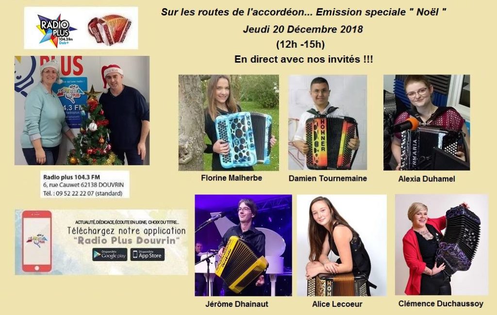 Jeudi 20 décembre, de 12 à 15h, l’accordéon fête Noël, Christophe Grébert et Sandra vous emmènent Sur les routes de l’accordéon, tout droit au Pays du Père Noël, en compagnie de leurs nombreux amis accordéonistes, présents en live dans nos studios, dans la joie et la bonne humeur, et l’esprit de Noël!