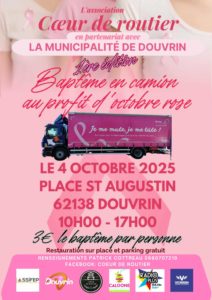 Enfin, alors que dans quelques jours démarrera le mois d’Octobre, focus sur l’action de « Coeur de Routier » à Douvrin, qui va récolter des fonds pour la lutte contre le cancer du sein dans le cadre d’Octobre Rose, au micro de Christophe PASQUIER.