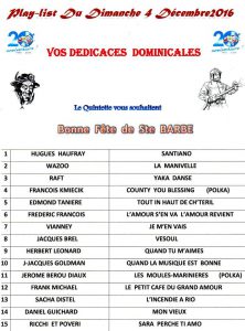 C’est tout d’abord avec votre quintette composé de Yves, Francky, Willy, JB et Dominique, dès 10h, pour les dédicaces dominicales. Ils vous proposent une émission autour de la fête des mineurs, la « Sainte-Barbe », avec quelques chansons autour de la mine, des pompiers, de notre région… L’occasion pour vous également d’appeler pour saluer et faire une dédicace à vos proches, voisins, amis, qui ont peut-être pour certains, connu la mine!