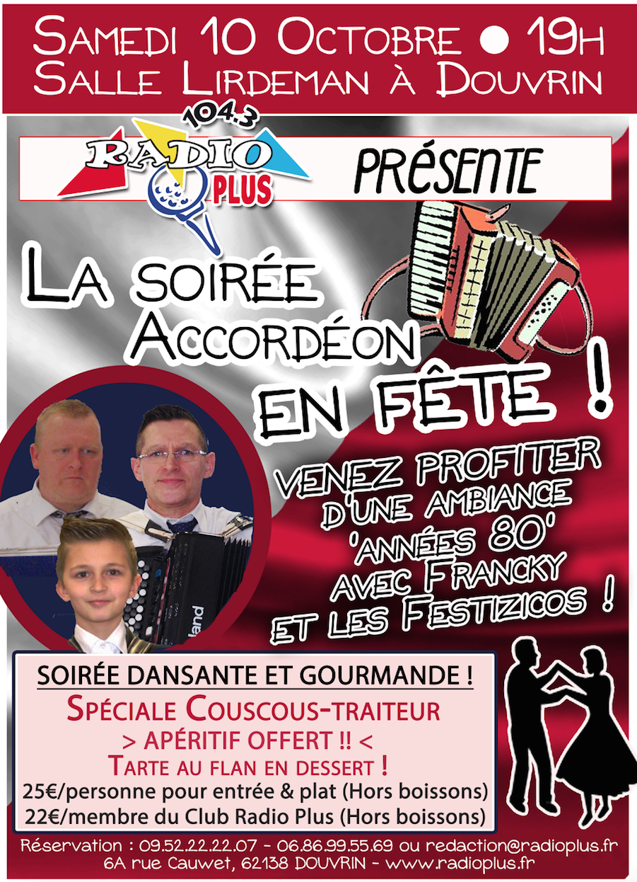 Une soirée à ne pas manquer ! Vous pouvez d’ores et déjà réserver vos places par téléphone au 09.52.22.22.07 ou par mail à l’adresse redaction@radioplus.fr (avec en objet « soirée accordéon »)