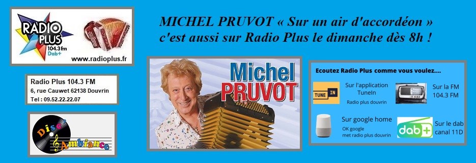 Précédé de votre flash d’informations, c’est Sur un air d’accordéon avec Michel Pruvot à écouter sans modération sur Radio Plus en FM (sur le 104.3) sur le territoire du bassin minier à Lens, Liévin, Bruay, Béthune… en DAB+ sur les récepteurs équipés sur les territoires d’Arras, Douai, Lille, Dunkerque… et partout dans le monde sur le www.radioplus.fr !
